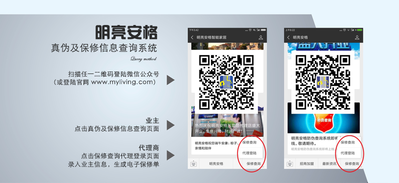 明亮安格公司緊跟時(shí)代發(fā)展,建立電子保修服務(wù)系統(tǒng),全國連網(wǎng)數(shù)據(jù)庫支持,正品保證,手機(jī)上即時(shí)錄入與查詢,讓安裝信息一目了然,可以為客戶提供更優(yōu)質(zhì)服務(wù)的同時(shí),使客戶更有歸屬感,信任感。